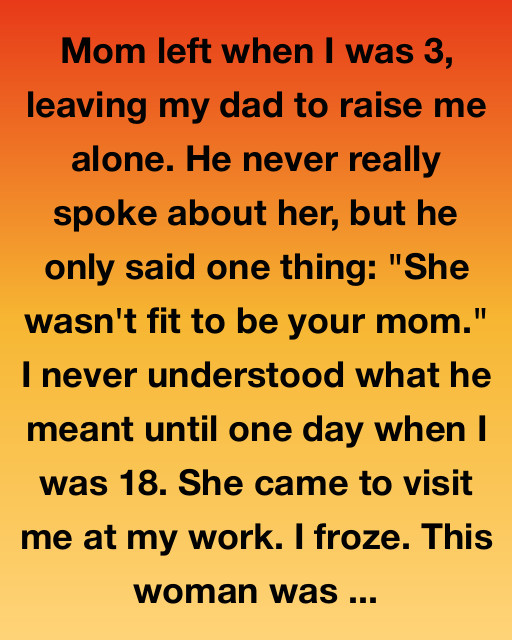 Mom left when I was 3, leaving my dad to raise me alone. He never really spoke about her, but he only said one thing: “She wasn’t fit to be your mom.” I never understood what he meant until one day when I was 18. She came to visit me at my work. I froze. This woman was standing at the counter like she had just walked out of a time machine.