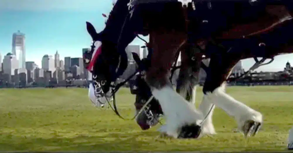 The commercial, without the backdrop of the twin World Trade Center Towers lost in the tragic events of September 11, 2001, masterfully captures the Clydesdales journey past iconic American landmarks. The horses pass the Statue of Liberty, cross the Brooklyn Bridge, and come to a respectful halt in a park overlooking the New York City skyline, all culminating in a solemn bow.