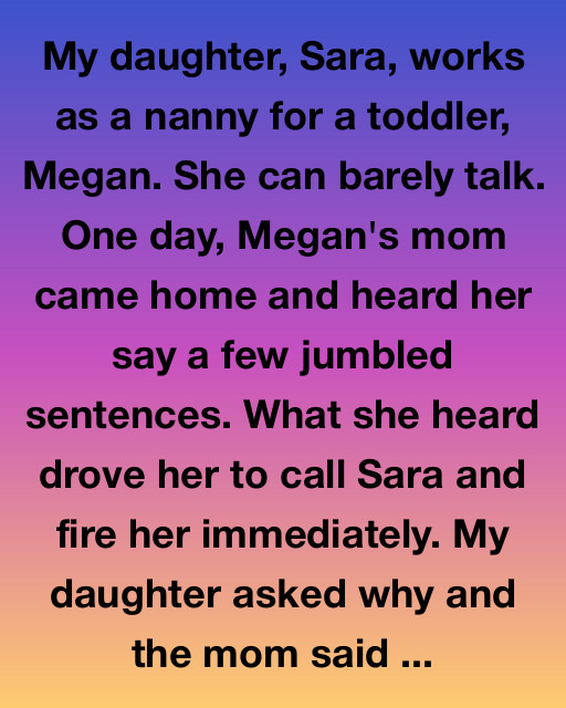 My daughter, Sara, works as a nanny for a toddler, Megan. She can barely talk. One day, Meganโs mom came home and heard her say a few jumbled sentences. What she heard drove her to call Sara and fire her immediately. My daughter asked why and the mom said, โBecause Megan just said, โSara said Mommy cry all day. Mommy sad. Daddy gone. No hug Mommy.โโ