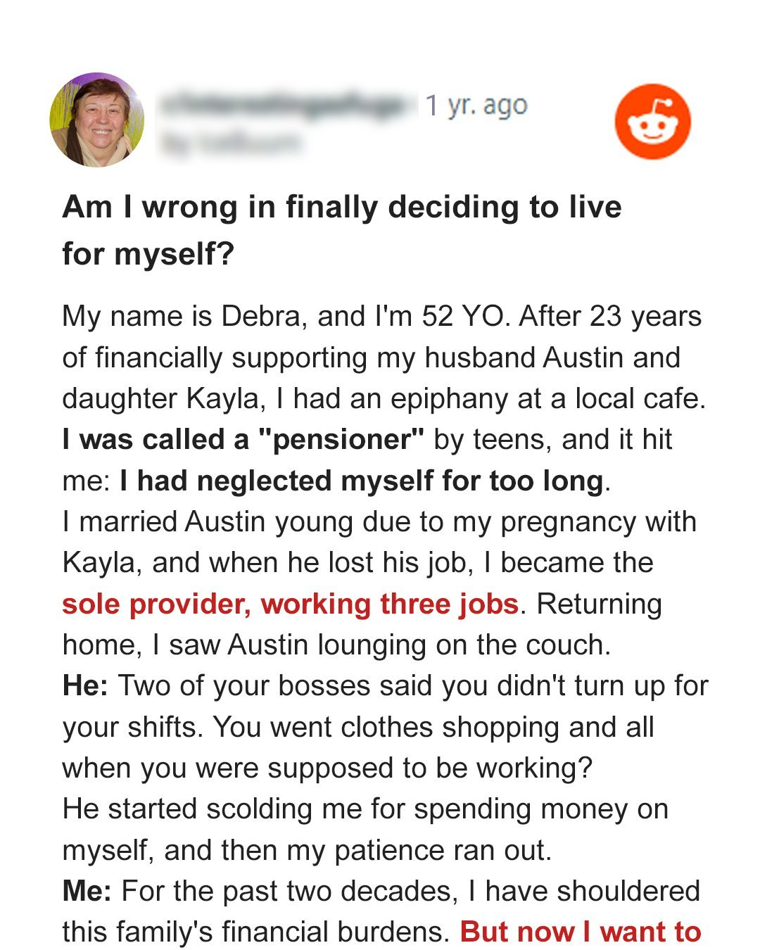 Debra’s husband, Austin, has been out of work for more than 20 years. Throughout this time, he has relied heavily on Debra for financial support, making her the family’s sole breadwinner. But a moment of self-realization at a cozy neighborhood cafe pushed Debra toward a pivotal life decision.