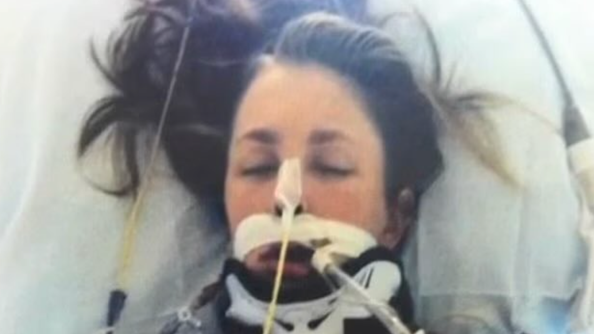 The force of the collision severely damaged the ligaments in her neck and dislocated the base of her skull from her spine, yet she survived the ordeal.